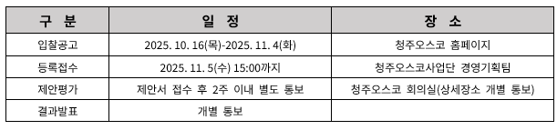 다. 제출장소 : 충북 청주시 흥덕구 오송읍 오송생명로 250 청주오스코사업단 경영기획팀 (043-230-4010)