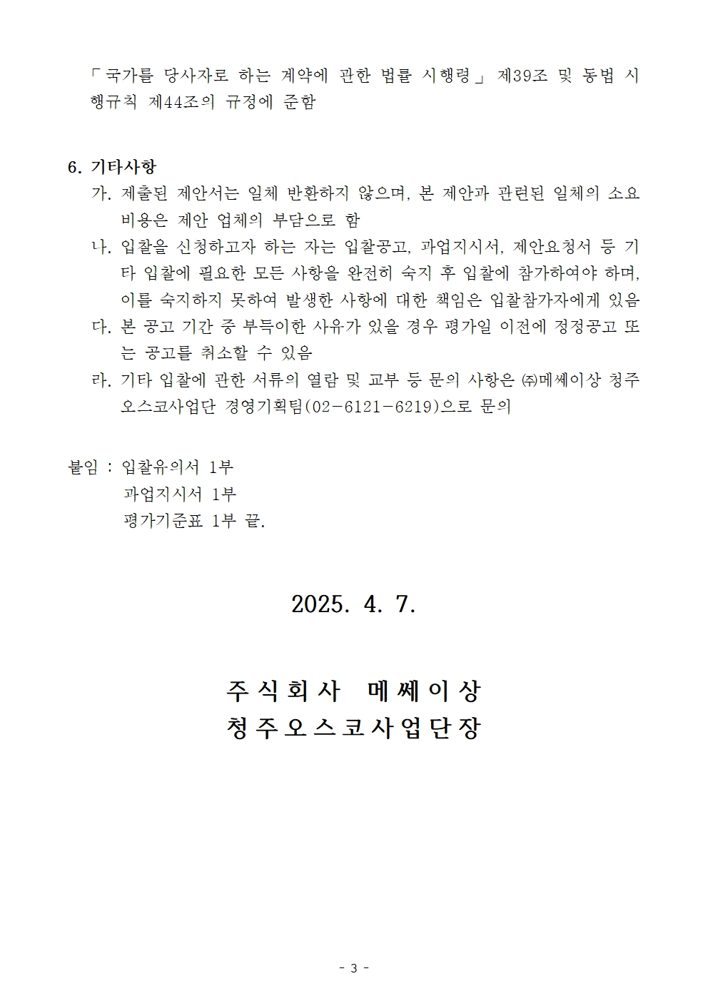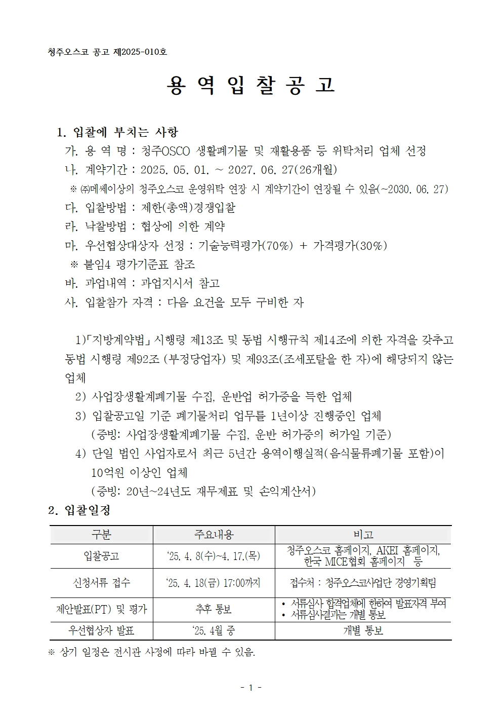 [입찰공고] 청주오스코 생활폐기물 및 재활용품 등 위탁처리 업체 선정 ( ~ 2025. 4. 18.)